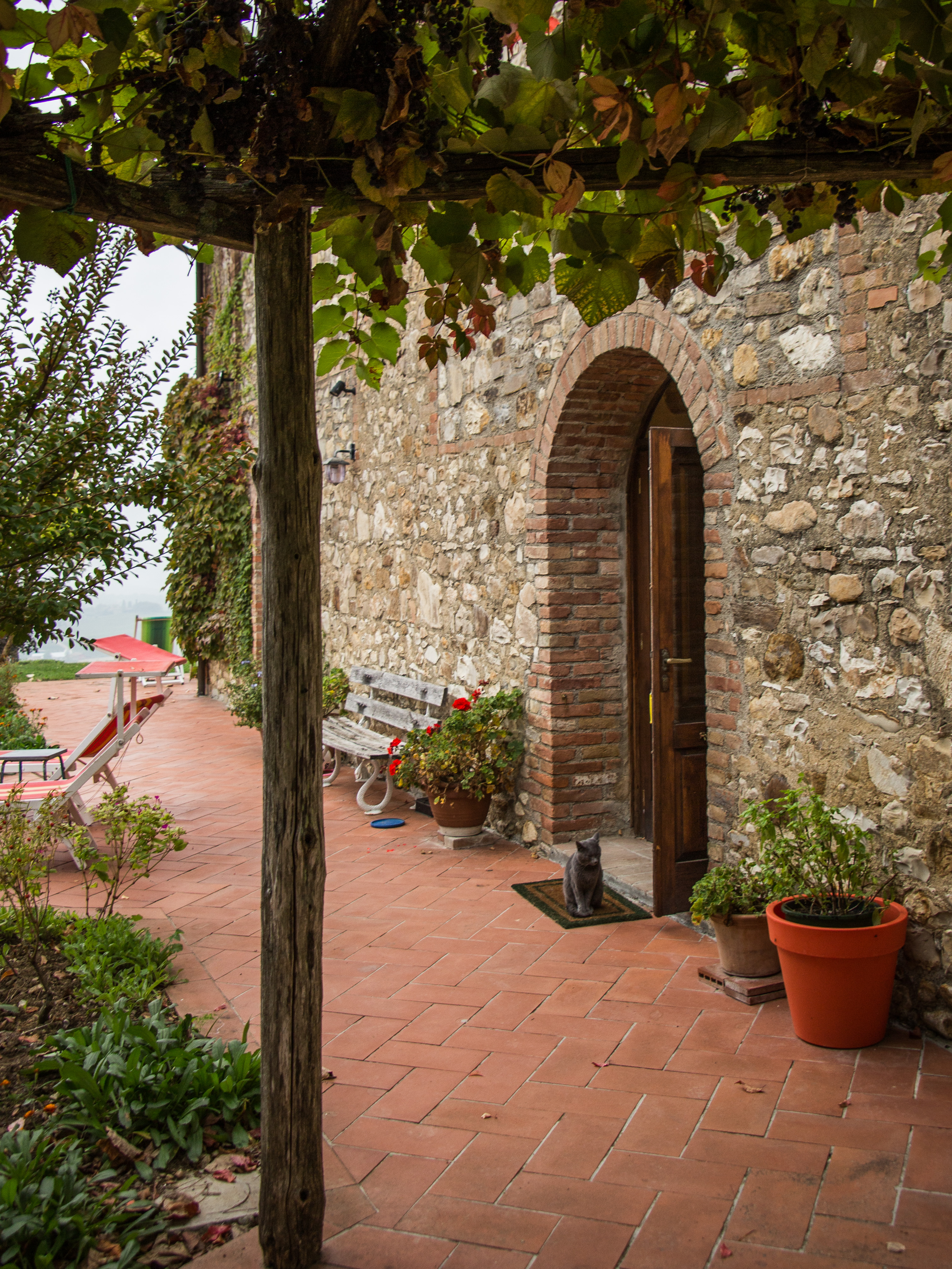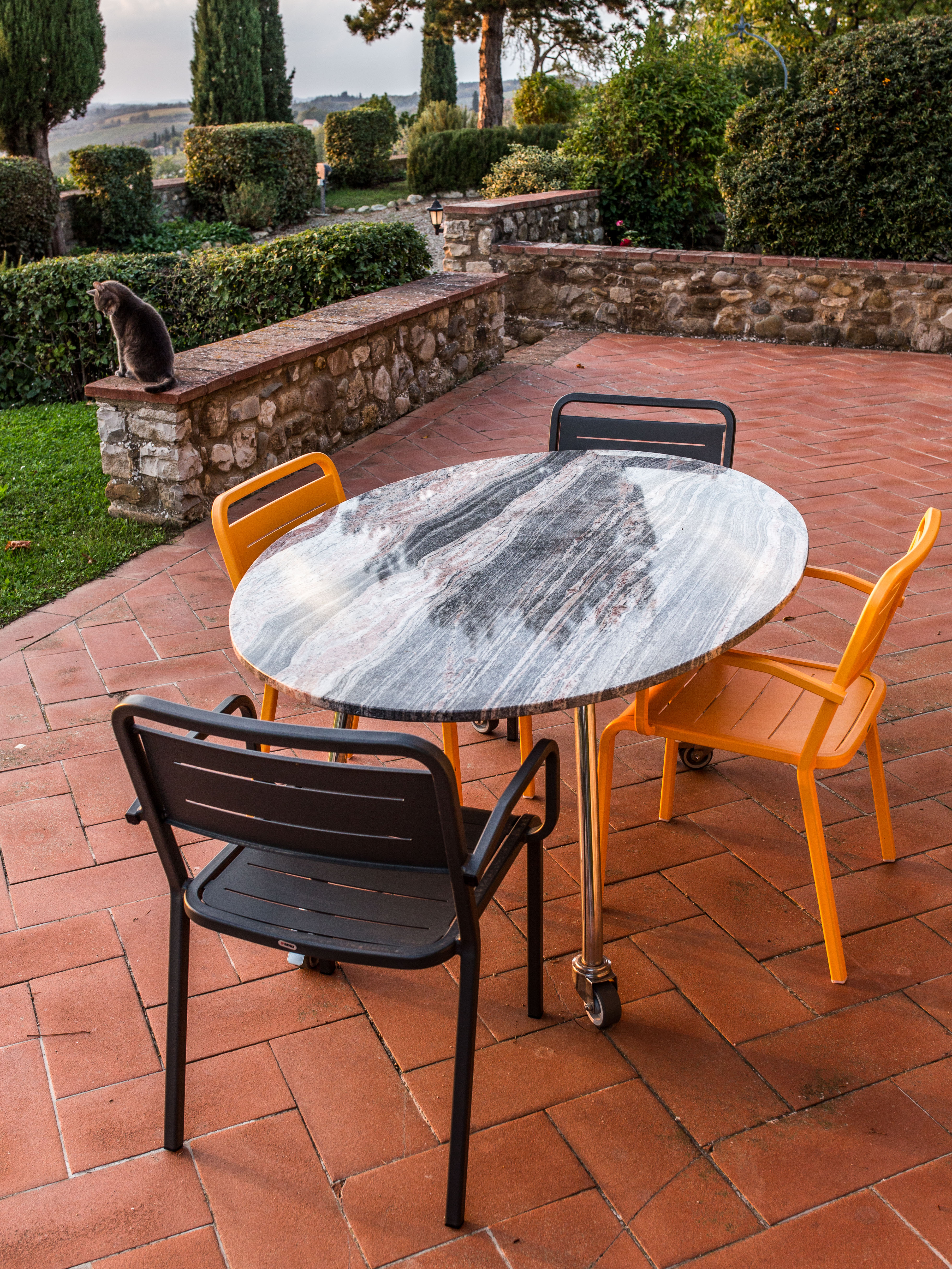 To make eating outside easy, we have two large outdoor tables – one on wheels – so you can choose your favourite spot. A vine-covered pergola provides midday shade, and a built-in barbecue can be used for outdoor cooking. At night you can sit on the west terrace and watch the sun set over the distant mountains. There are outside lights and plenty of candles so you can have dinner outside watching the lights in the valley below and the stars above.