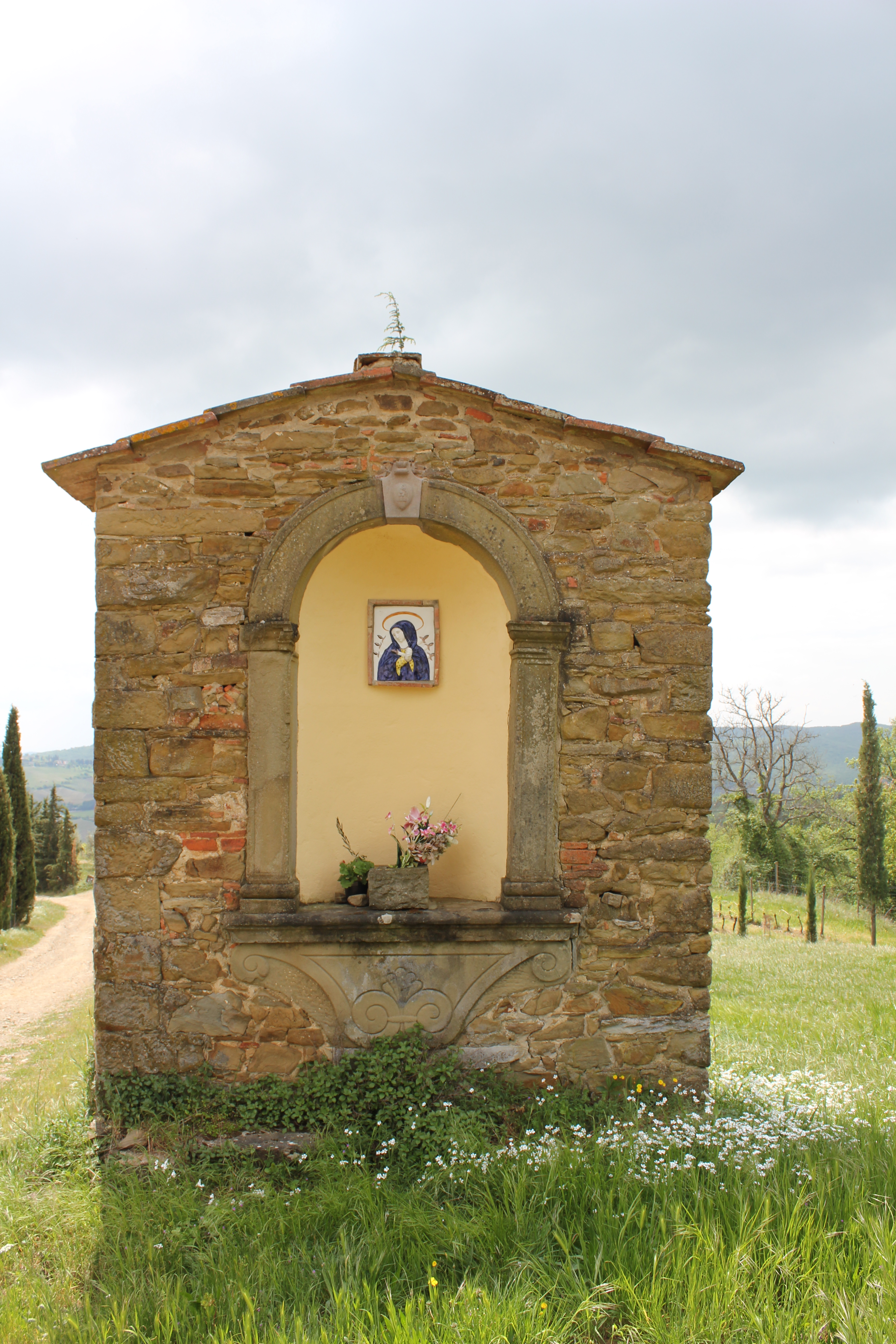 Come out of the main gates at Le Bagnaie and walk down the track to the junction. Turn left and continue walking until you see the sign indicating the turning for Fattoria Campalli on your left. Take this road up to the main house. It’s a beautiful avenue of cypress trees. Take the path to the left of the property which runs along the wall.